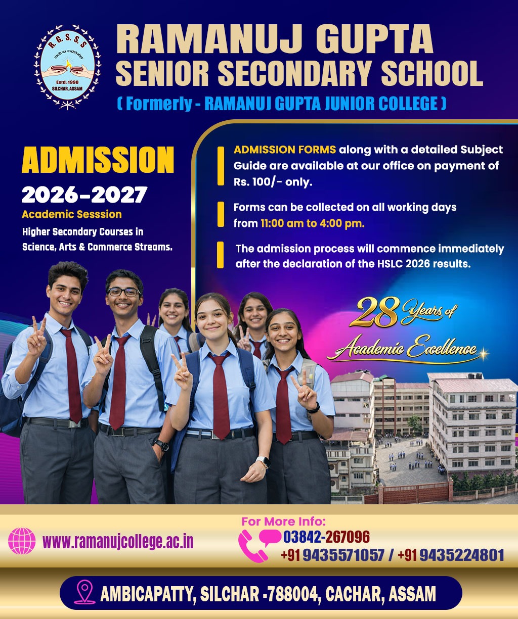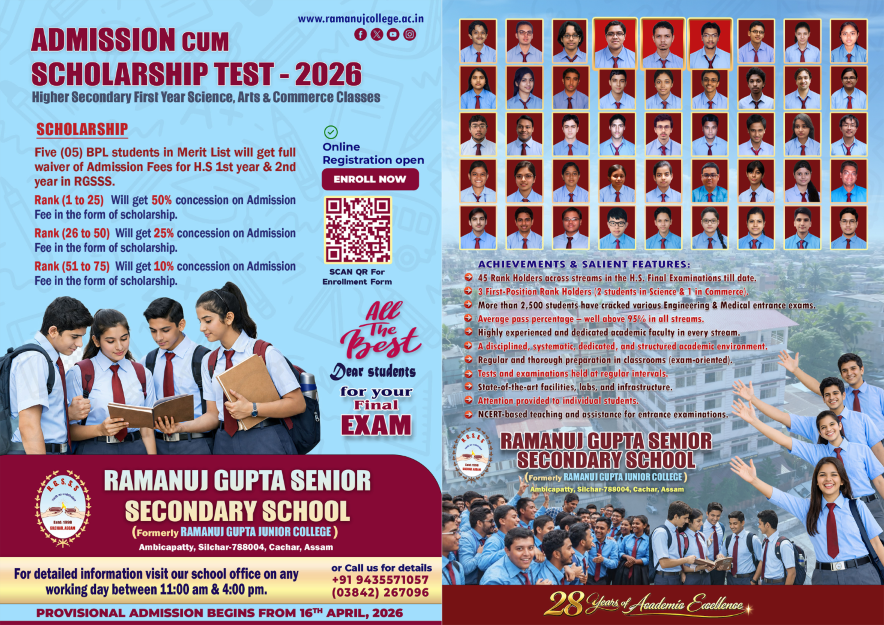During his brief span of life, he always wanted to make his services available for the society in which he lives. Ramanuj had his dreams and vision. In order to make his dreams a reality, we have taken the initiative to set up "Ramanuj Gupta Memorial Charitable Trust". The main objective of the Trust is 'Service to the poor with potentialities'. The Trust believes in heart and soul that "God loveth a cheerful give'. The maiden venture of the Trust is the establishment of one full-fledged Science College here at Silchar, situated in the southern part of Assam. The College is known as "Ramanuj Gupta Junior College" and a high school named as "Ramanuj Vidyamandir". A good number of renowned educationists and veteran teachers of this town have been extending their helping hands in all possible ways to make this project a great success.